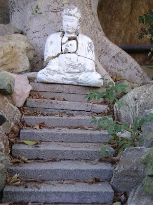 A really neat Asian-inspired section of the garden--Buddha is perched atop a mini-staircase underneath an amazing white-barked tree.